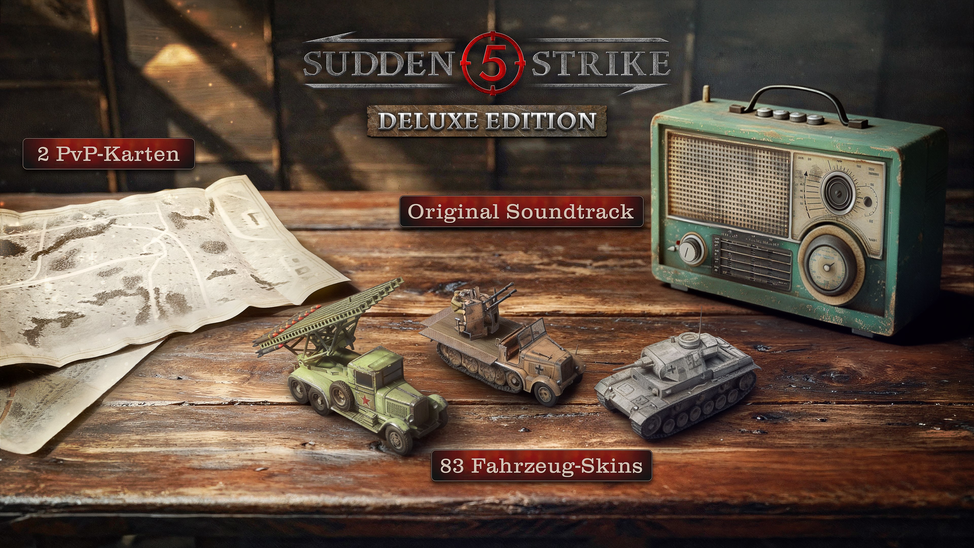 Mit der Deluxe Edition von Sudden Strike 5 erhalten kampferprobte Generäle nicht nur die Herausforderungen des Hauptspiels, sondern auch Zugang zu einem zusätzlichen Arsenal exklusiver Extras. Rüste deine Truppen mit einem umfangreichen Skin-Paket für Fahrzeuge aus, und stell deine taktischen Fähigkeiten auf zwei exklusiven PvP-Karten-Versionen unter Beweis.