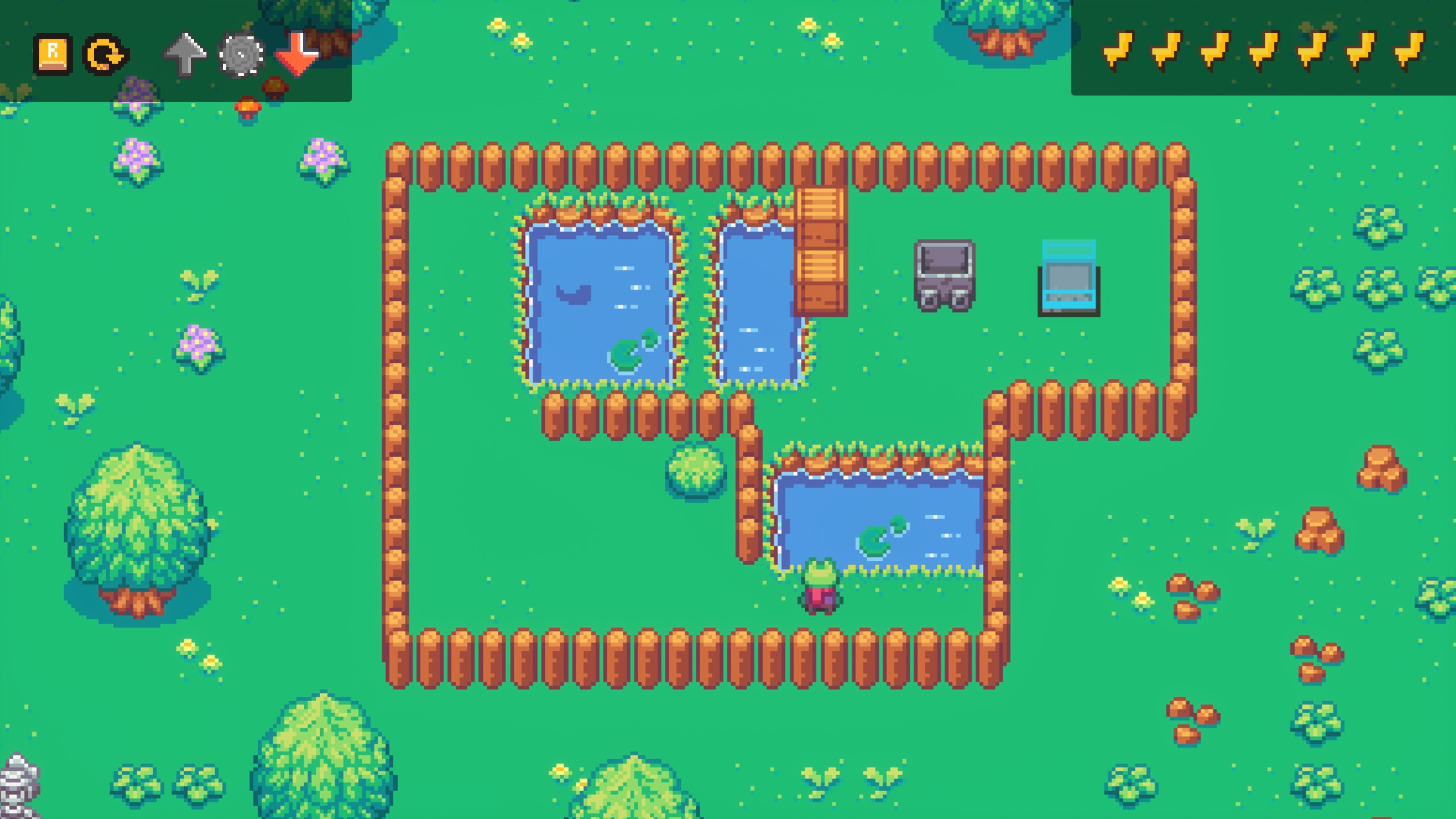 – Niedliche 2D-Pixelgrafik aus der Vogelperspektive mit ruhiger und liebevoller Umgebung.