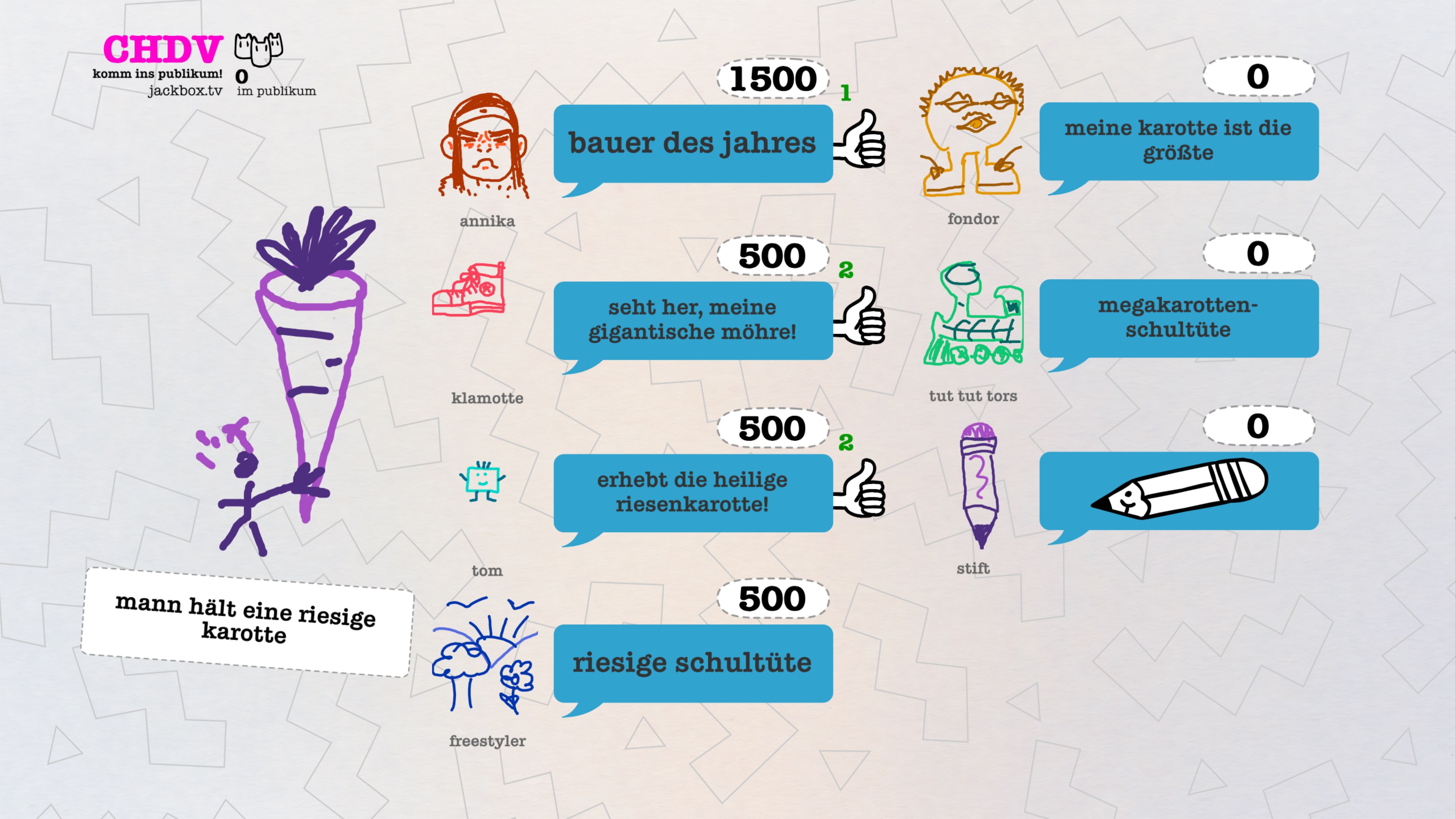 Die Spieler tippen ein, was die (wahrscheinlich fürchterliche) Zeichnung ihrer Meinung nach darstellen soll, und dann stimmen alle ‒ sogar ein Publikum von potenziell Tausenden von Spielern ‒ darüber ab, was sie für die richtige Antwort halten.